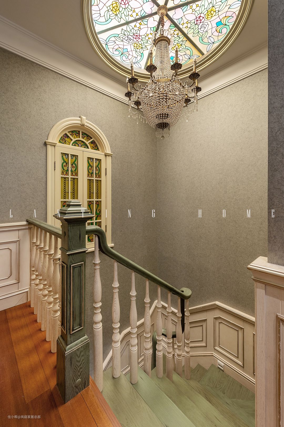 法式风十足的栏杆搭配上墨绿色的胡桃木扶手与地板,气质优雅。