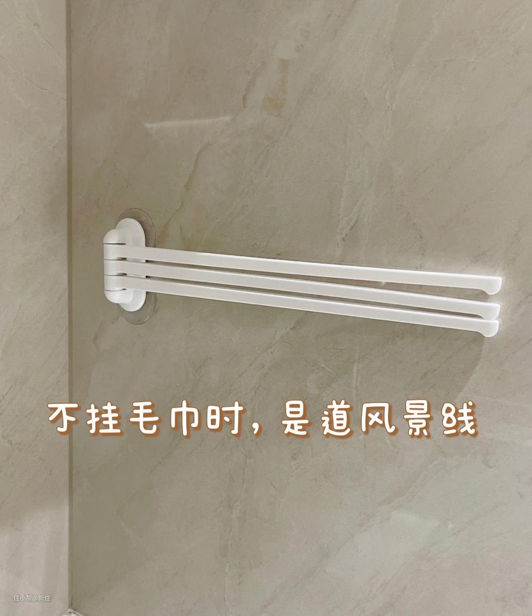 所以,在设计卫生间时,一定要考虑毛巾架的安装位置,普通双层的,前后会挡住,不好拿取,也不好晾干,单层的收纳数量又有限,可以考虑这种可旋转的。