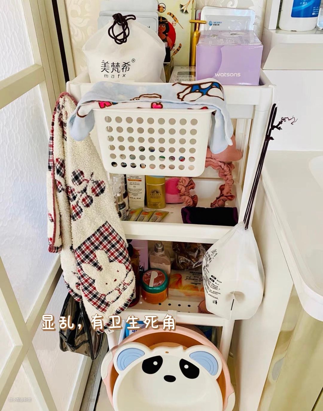 卫生间空间狭小,再摆上置物架,无疑是雪上加霜,徒增凌乱和拥挤,而且,大大小小的东西塞到架子上,很容易产生卫生死角。