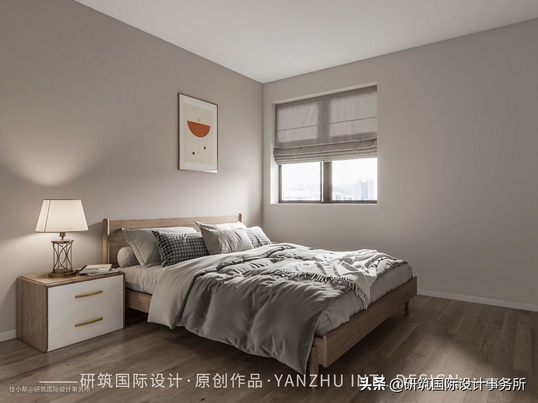 主卧浅灰色墙面、白色平顶与浅色木地板相互呼应,巧妙地将飘窗下方改成具备收纳功能的柜子,为室内可以具备更高的收纳功能,同时使空间更加具备层次感,使用浅白色大理石做飘窗台面,原木材质的床与床头柜,床头背景悬挂简约装饰画,除此之外没有多余的装饰,简约有凸显高级。