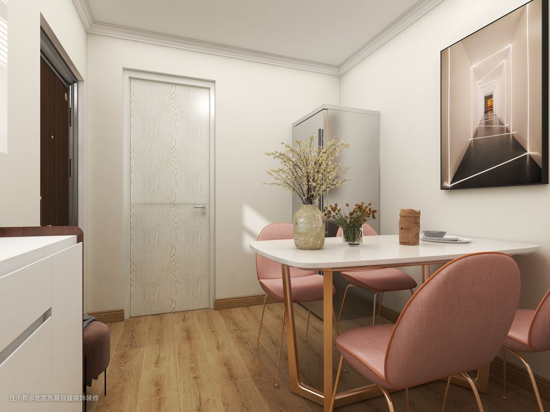 入门自购了一个鞋柜,并没有占有太多空间,因为客餐厅太过狭小,很难满足两个功能同时具有,于是餐桌做了四人桌,偶尔还能会客,动线简单明了,颜色以亮色为主,显示空间明亮大方。