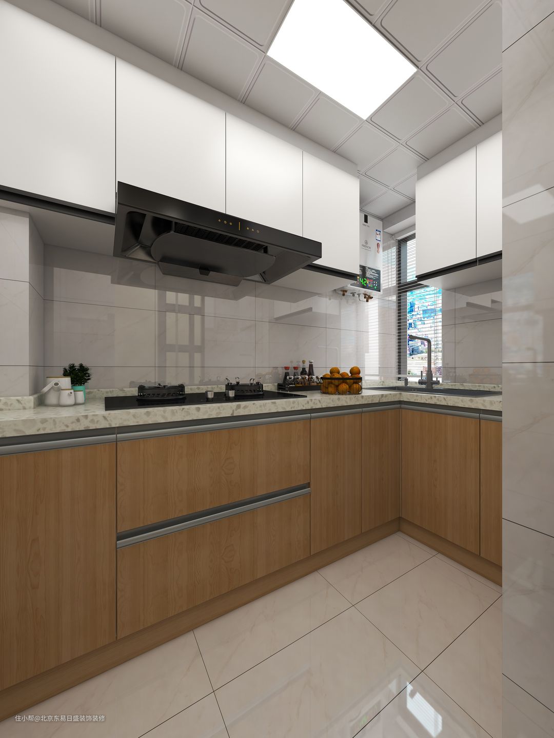 由于客户喜欢做法,所以厨房还是保证原户型的封闭式,以简单的白色的为主,地柜门板为木色,吊柜门板选择高光面板,容易打理,空间整体显得扩大很多。