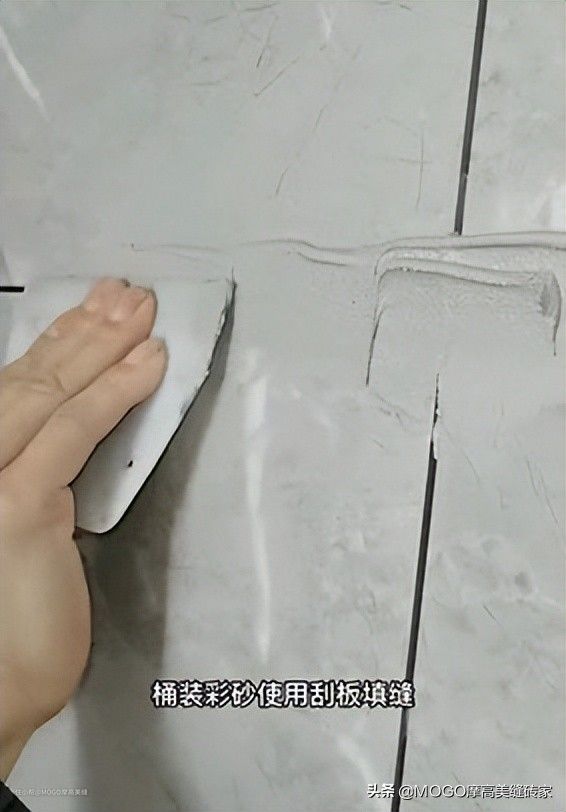 桶装彩砂使用刮板填缝,可以做出平砖平缝的效果,施工时是纯手工擦洗,工费较贵。