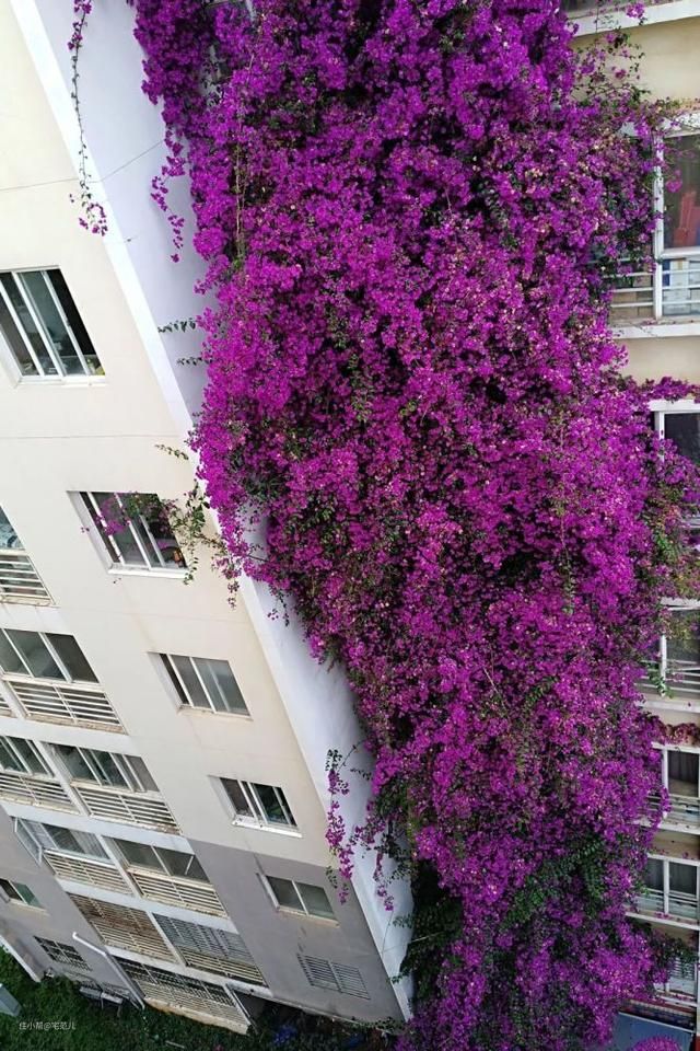 远远望去,这棵三角梅犹如一帘紫红色的“鲜花瀑布”从楼顶倾泻而下,颇为壮观,吸引无数的人前来拍照打卡。