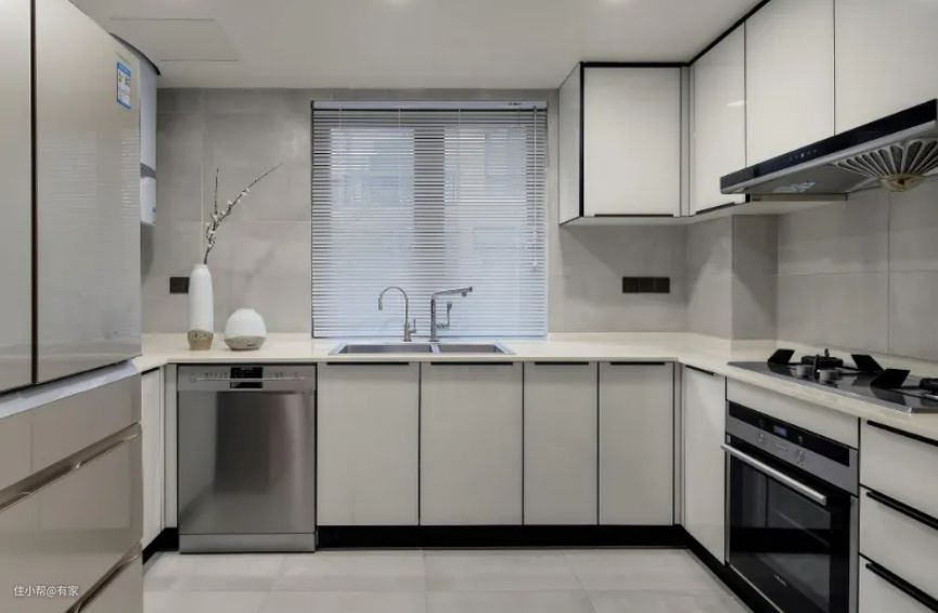L型就是在一字形的基础上多出一个拐角,水槽和灶台分别放在橱柜两边,中间作为备菜区,这样洗菜、备菜、炒菜的动线布局就非常合理,多了个拐角也多出了储存的空间,减轻了厨房的储存压力。