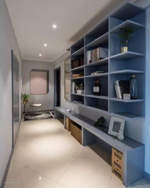 玄关在日常生活中的使用度比较低,主要是换鞋,因此对灯光的亮度要求不是很高,不需要为了追求亮度而装那种较为复杂的吸顶灯,容易积灰,不方便打扫,不耐看,还容易坏。因此可以装射灯或者灯带,简单美观又实用,还方便清洁,容易营造出高端大气又简约低调的氛围感。