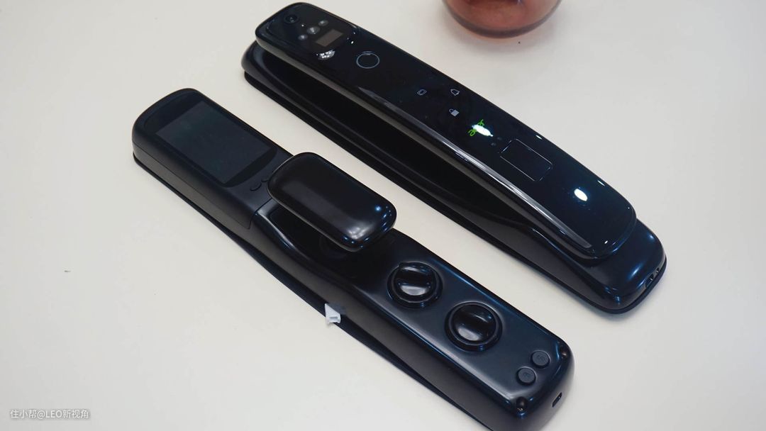 外侧面板上方是猫眼视频的摄像头,下方三枚是3D人脸算法感应元件,方形的是显示屏,而再下方圆形区域是半导体指纹采集头。