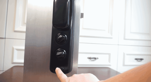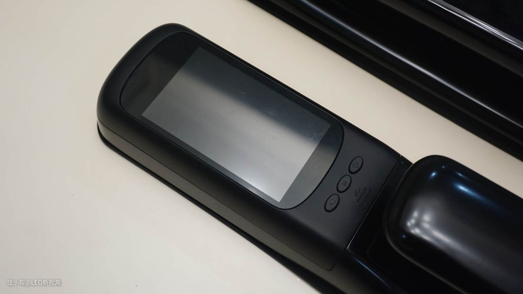 内侧面板上方是一块高清超大的显示屏,这个是完全集成了智能猫眼的工作,一旦有人按门铃,显示屏就会现实门外情况,并且拍照记录。显示屏中间的按键是显示屏开关,按下就能查看门外状况。