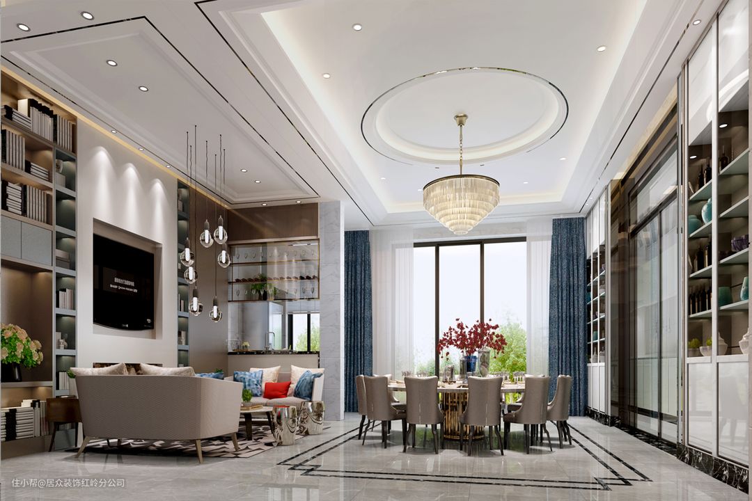 如果是横厅大户型,沙发不靠墙摆放的效果更好。将沙发摆在客厅与餐厅之间,格局大气,横厅沙发后的餐桌椅布置,需要根据客餐厅的整体面积而定,如果沙发后方空间充裕,可以让餐桌垂直沙发摆放,中间留空出一定的动线位置。