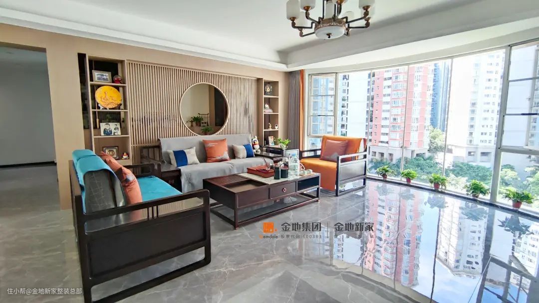客厅明亮宽敞,全景落地窗设计,让光线自然映射,空间自然柔和,演绎东方美学意境。