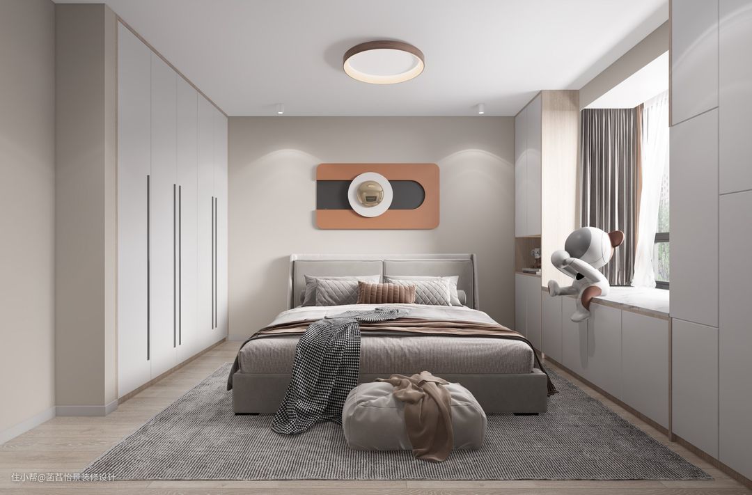 主卧的布置干净舒适,定制的收纳柜嵌入到墙体中,在窗台处也做了定制的收纳柜,增加空间的收纳面积。一张灰色调的双人床,营造出一个柔和舒适的休息氛围、