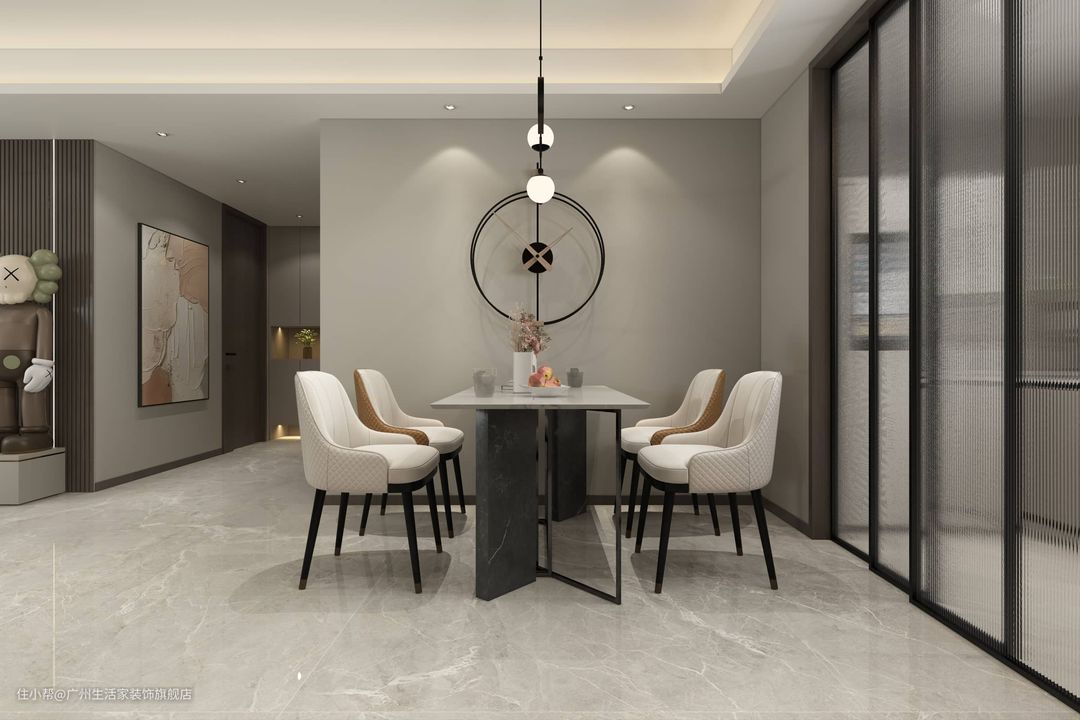 餐厅:客餐厅在同一个区域,整体色调一致,四人的餐桌椅搭配墙面的软装,整体显得简单、时尚。