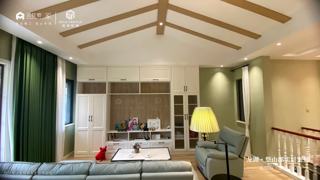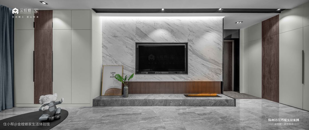 背景墙用储物柜代替,收纳量翻了好几翻,承担了家里大部分的储存负担。封闭柜+开放格的组合设计,收纳展示两不误,还能丰富柜体的层次感。
