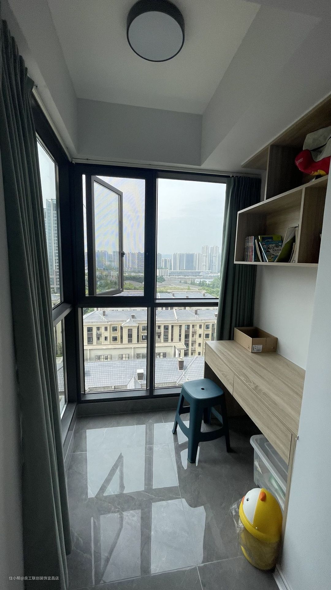 阳台的位置就是小孩的欢乐天地,这里有书籍可以供孩子们阅读,木质的桌子可以放许多玩具,玩累了也可以看看窗外,享受寂静的风景。