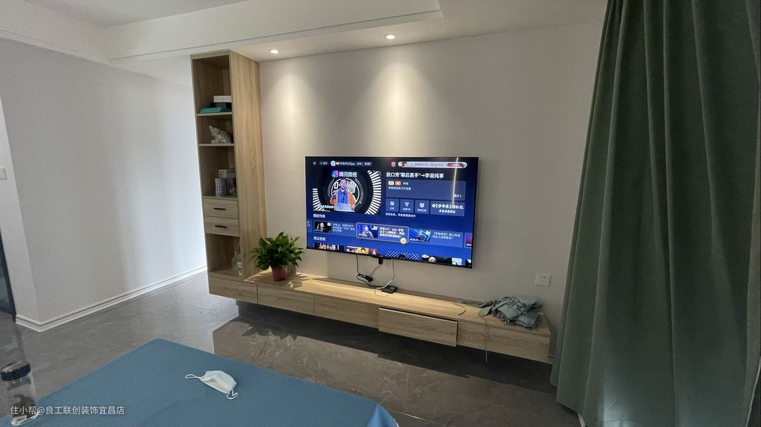 客厅地板是大理石,整体看起来光滑细腻,白色的墙壁简洁干净,电视两旁有柜子,可以放许多东西,浅绿色窗帘为整个客厅增添了一丝色彩。