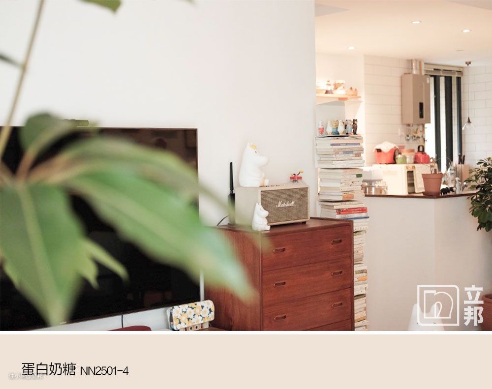 白色和奶茶色是能够给到人安全感的颜色,小安心在卧室选择了OW03-4珍珠白,客厅则大面积涂刷NN2501-4蛋白奶糖,珍珠白自带的莹润气质温柔中透露着自由,搭配淡淡的奶茶色调,烘托出浓郁醇香的氛围。