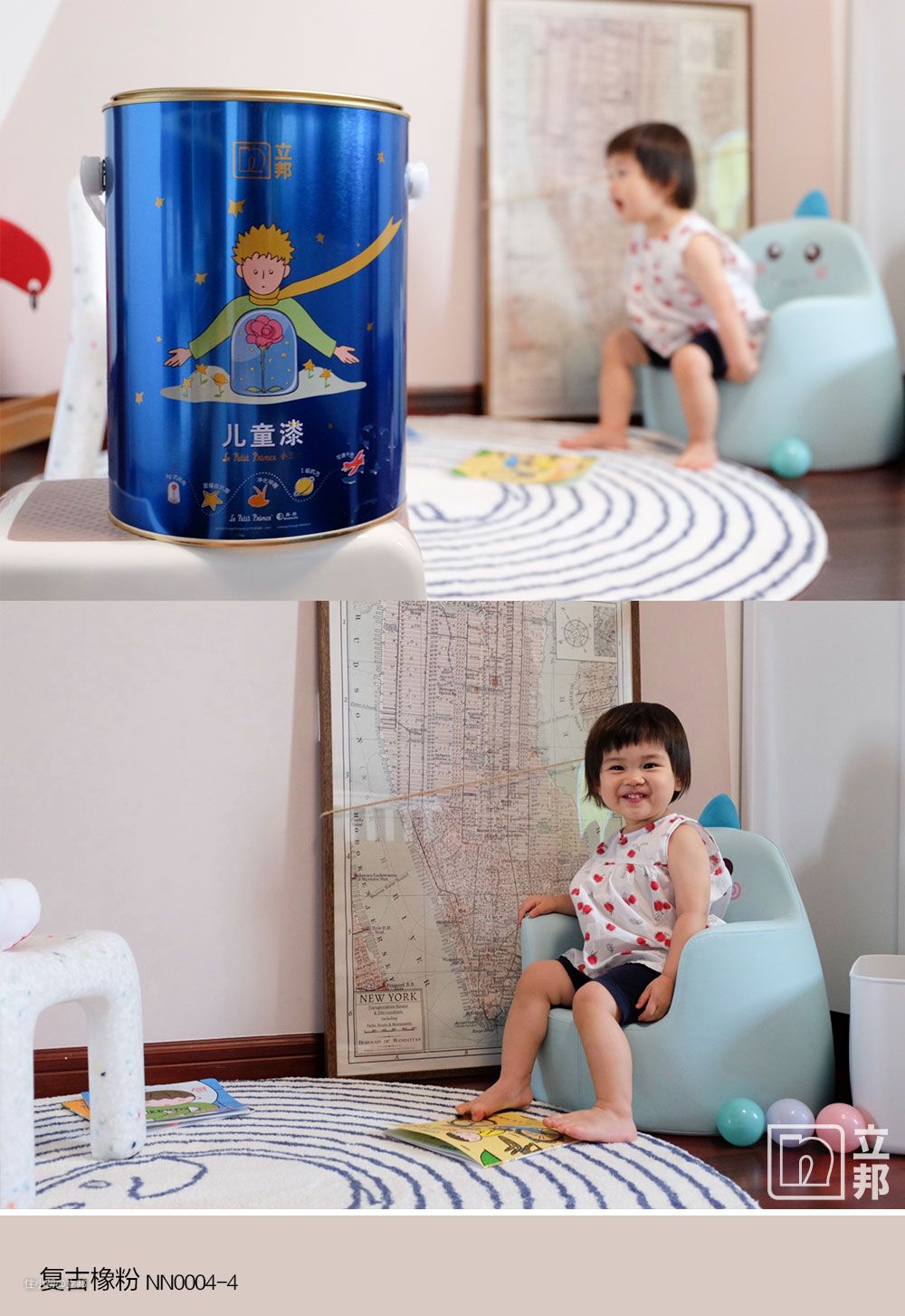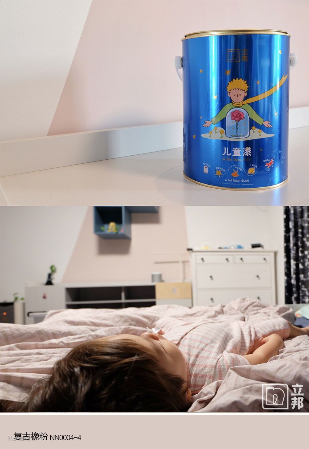 使用NN0004-4复古橡粉进行局部涂刷,与白墙形成拼色墙效果,粉+白的搭配,干净又甜美,住在这样纯净、简单、梦幻的房间里每晚都会做甜甜的公主梦!而且,它竟然还能够抗菌,宝爸宝妈可以尽情放心宝宝的健康。