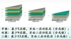通常具有三层功能层(银层),加上其他的金属及化合物层,膜层总数达到13层以上。