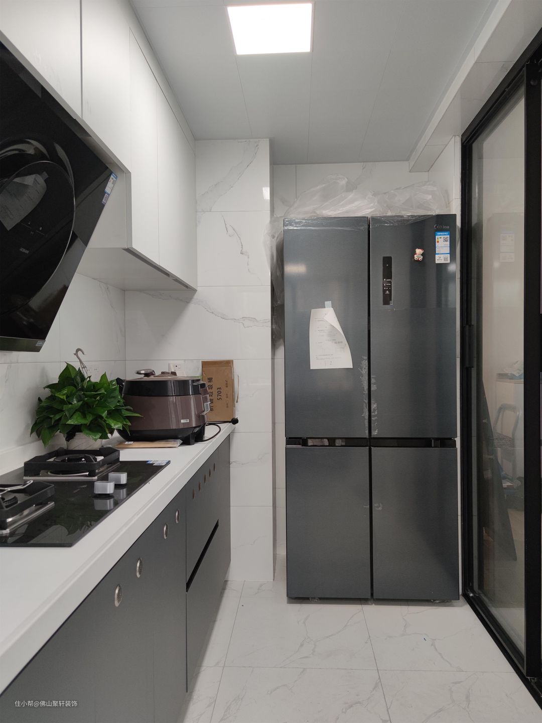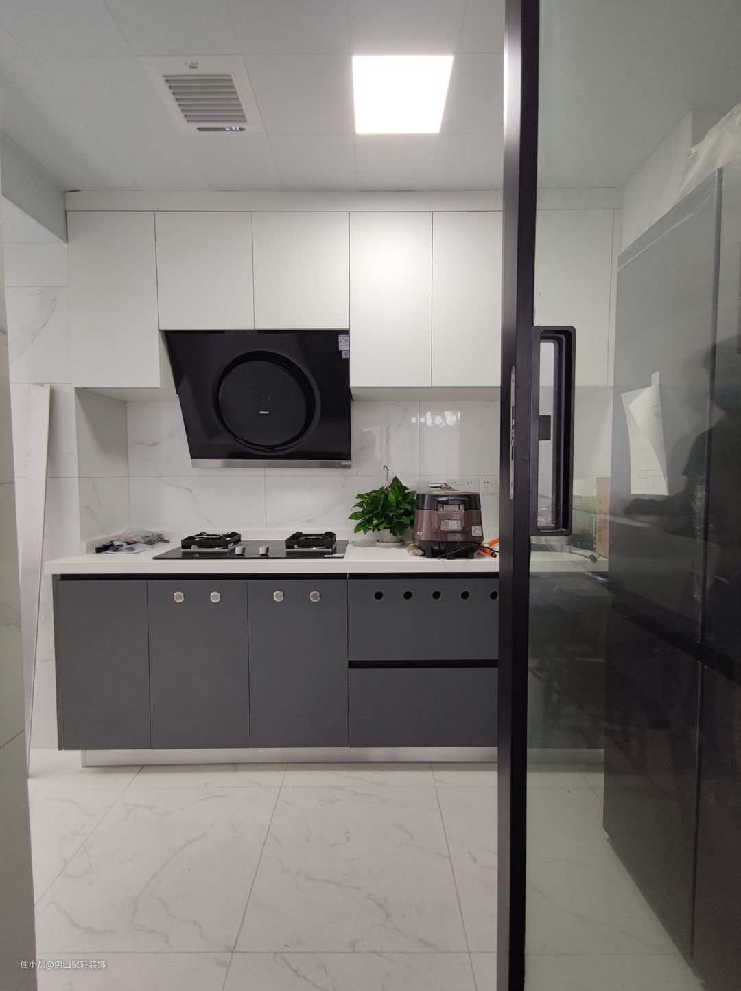 U型厨房设计,嵌入大冰箱,最大限度利用空间佛山聚轩装饰2022-06-16餐厅后即厨房,用通透的玻璃门做隔断,保证了两个空间的采光不受影响。U型厨房设计,嵌入大冰箱,最大限度利用空间。因柱体的阻挡,整个操作台并没有连起来,备餐区独立面窗。厨房黑白灰的配色,干净利落线条分明,定制橱柜为料理提供充足的收纳空间。