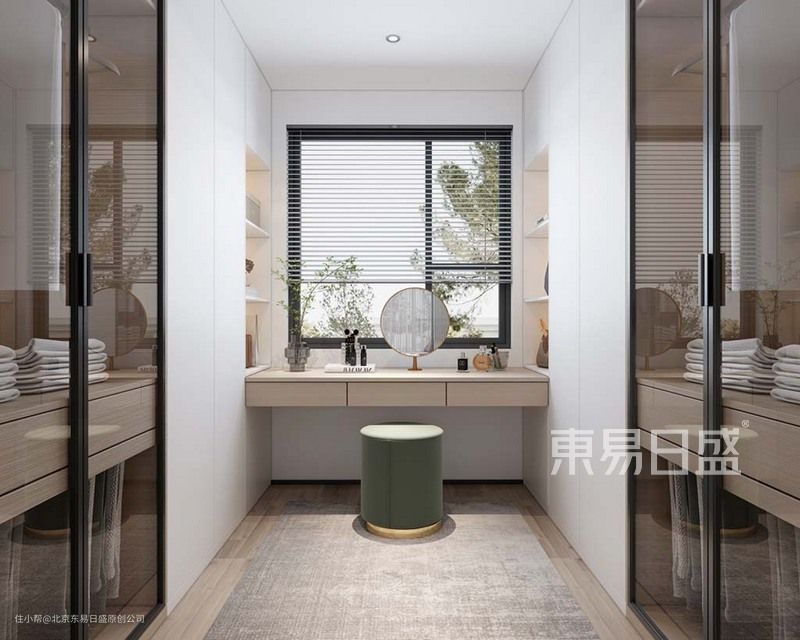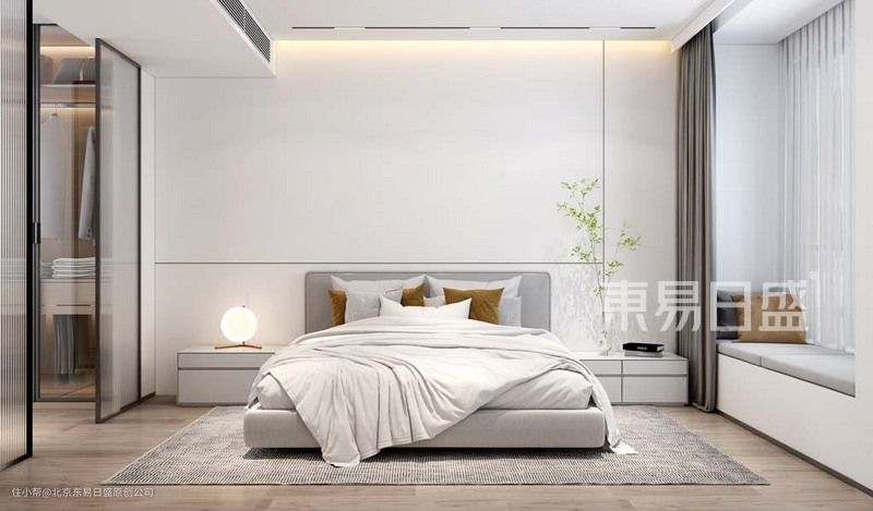 暖色是主色,地板是铺好的。在衣柜的设计中,用玻璃材质代替传统衣柜的木质门板,使整个空间简洁大气。
