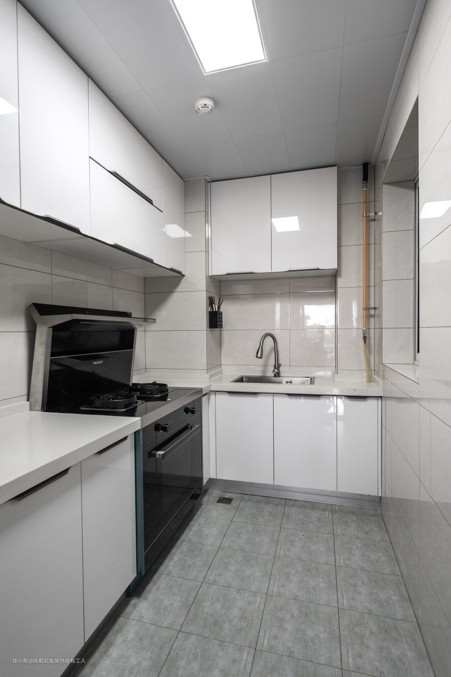 PET膜板柜门的好处是,反光透亮,让小空间厨房看起来不那么压抑,而且相比于UV漆门来说,更加耐磨,质感也更加好。