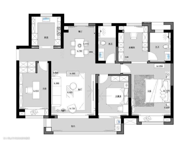 - 玄关的右侧依次是书房、客厅、儿童房以及主卧,客厅连接阳台,显得更加宽敞,主卧配套主卧和衣帽间,增强了收纳功能。