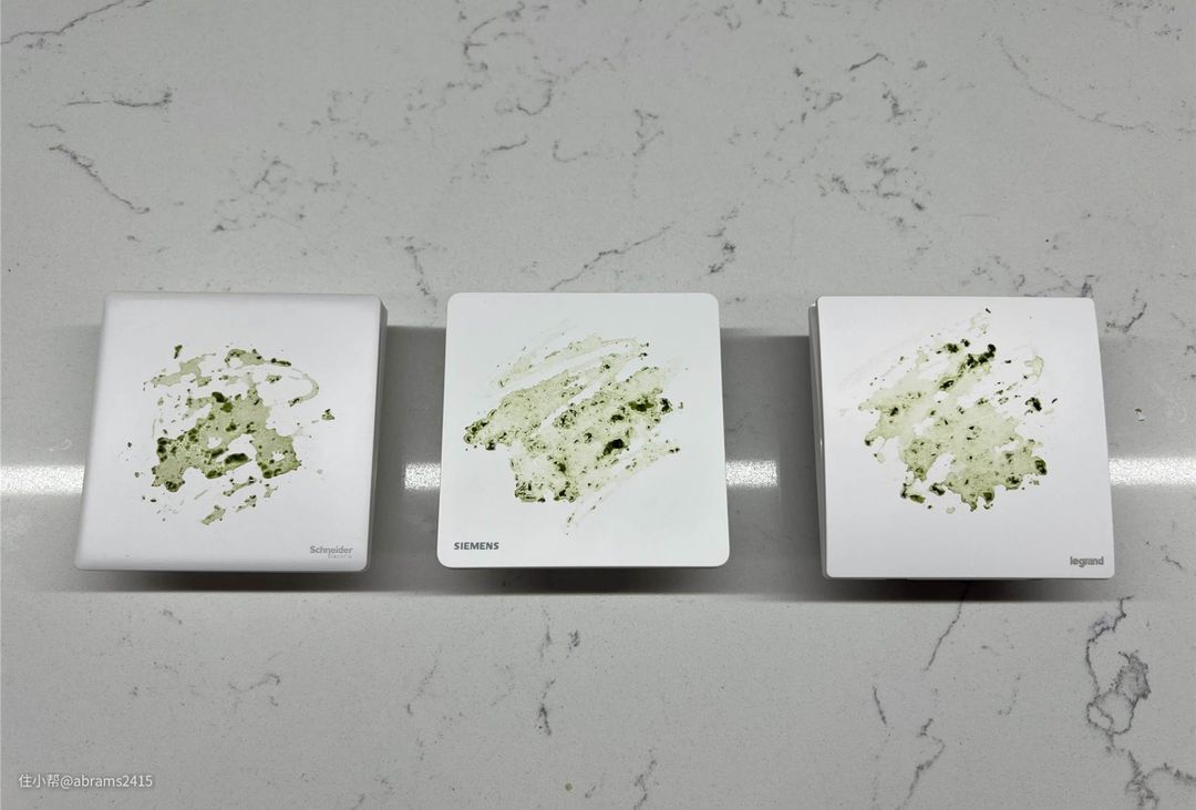 ▲首先申明,三款插座表面污渍能完全清除干净。但这里我用半干湿纸巾轻轻擦拭3遍,结果如上图。西门子睿宸开关表面有UV漆,所以能完全擦拭掉污渍。而其它两款就留有淡淡的痕迹。西门子睿宸系列日常清理更省心一些。