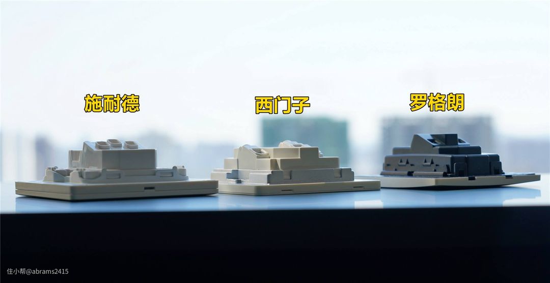▲开关键程从短到长排列:西门子2.8mm<施耐德3.1mm<罗格朗6.4mm。