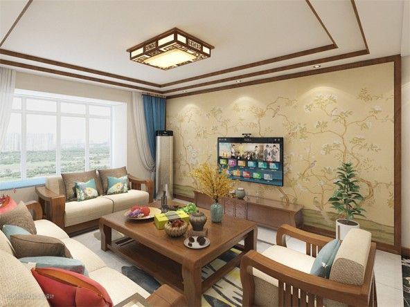 格栅吊顶就是采用原木材做成框架,在镶嵌上磨砂或透光的玻璃,光线通过玻璃照射下来。使得整个客厅的光线显得更加舒适柔和,而且格栅吊顶设计具有不错的装饰性,可以使客厅更加的美观。