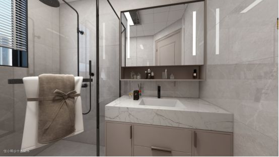 卫生间采用干湿分离的布局设计,钻石型淋浴房与悬空式台盆柜,不占用空间还耐看实用,不失为小卫生间的装修首选。