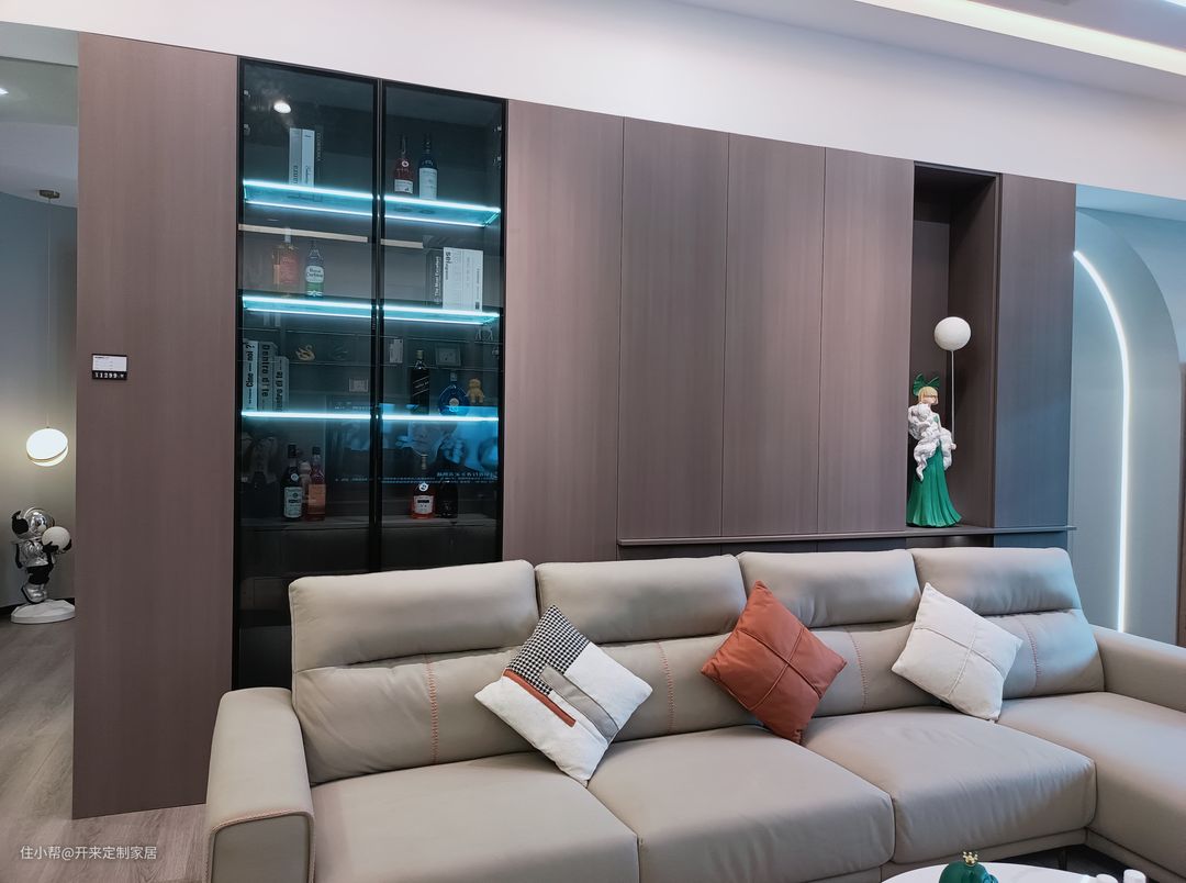 房子装修定制家具时建议装一个沙发背柜兼做餐边柜+书柜功能,用来收纳一些生活用品或小家电,玻璃柜储书储酒休闲有品位,装饰实用很有质感。