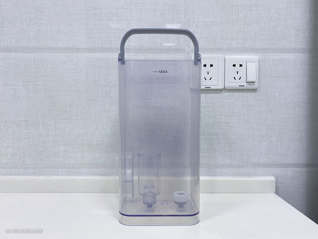净饮机的水箱设置在主机后侧,打开盖子后可以方便地提取水箱。