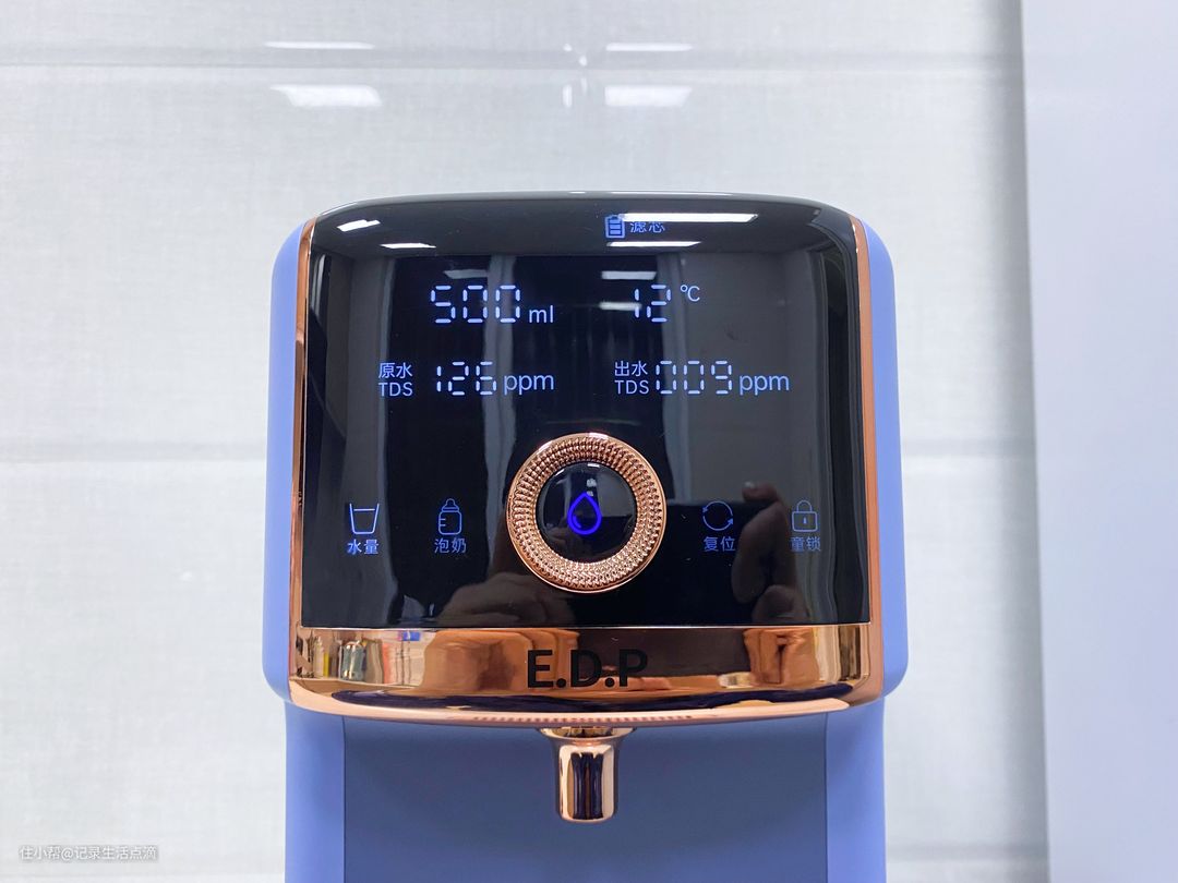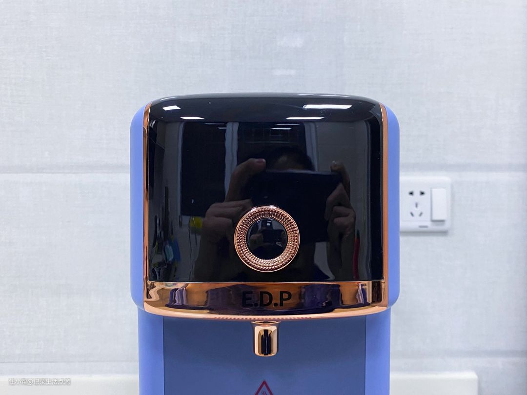 宜盾普蓝海豚净饮机有着不错的颜值,海蓝色的主色调让蓝海豚这个名字也名副其实,加上香槟金线条和黑色显示面板,给净饮机更添一分典雅时尚。