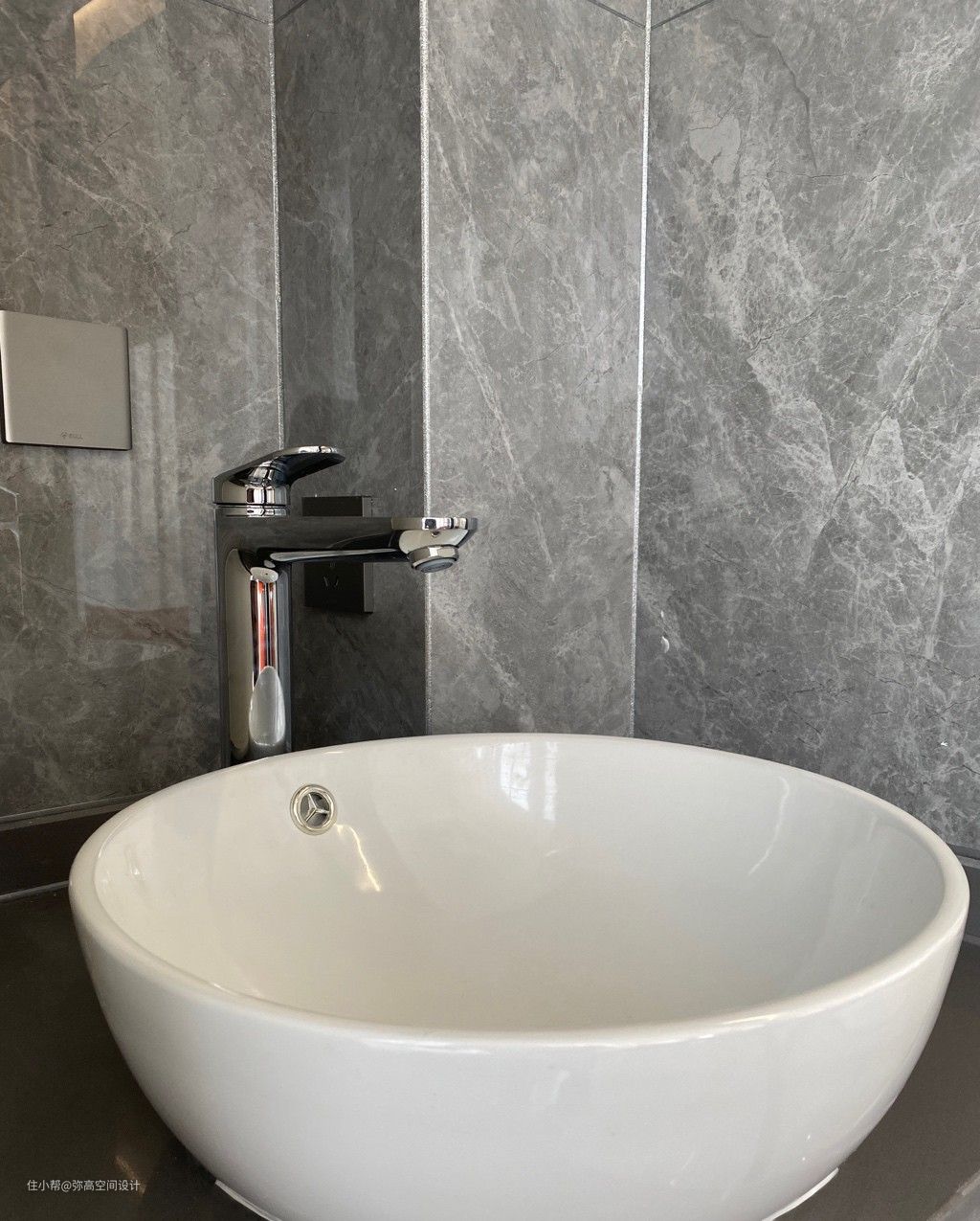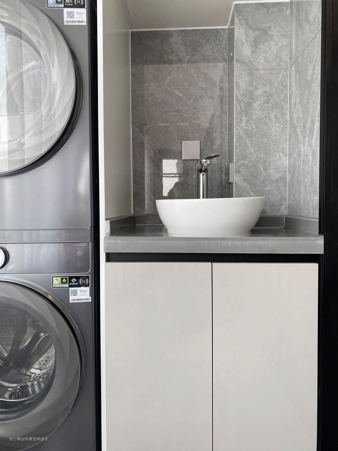 洗衣柜右边则是洗手池+吊柜的设计,洗手池采用台上盆造型,配合银色加高版的 Duravit 杜拉维特水龙头,非常实用。