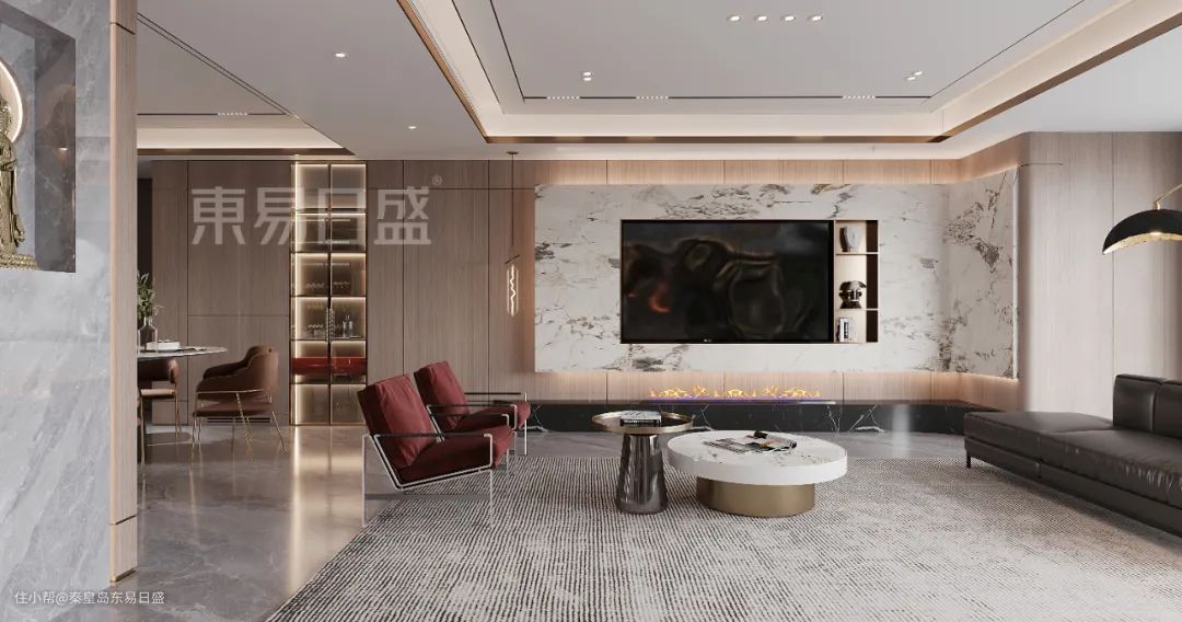 客厅的整体色调以木色墙板为主,暖色的灯光调节氛围,突显高级感。电视背景墙以简洁为主,采用岩板与木色墙板结合的设计,弧面造型设计增加了空间的延申感。