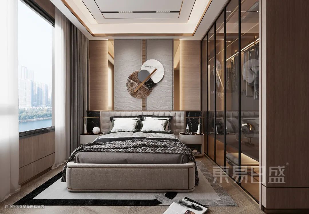 吊顶设计给人一种奢华之美,让它简单而又不简单。卧室背景墙的设计与衣柜在造型和配色上相互呼应。