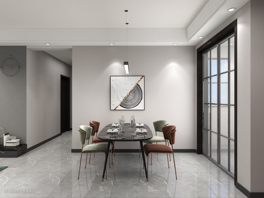 客厅旁便是餐厅,大理石板面的实木桌搭配莫兰迪色餐椅,精致不显山水。