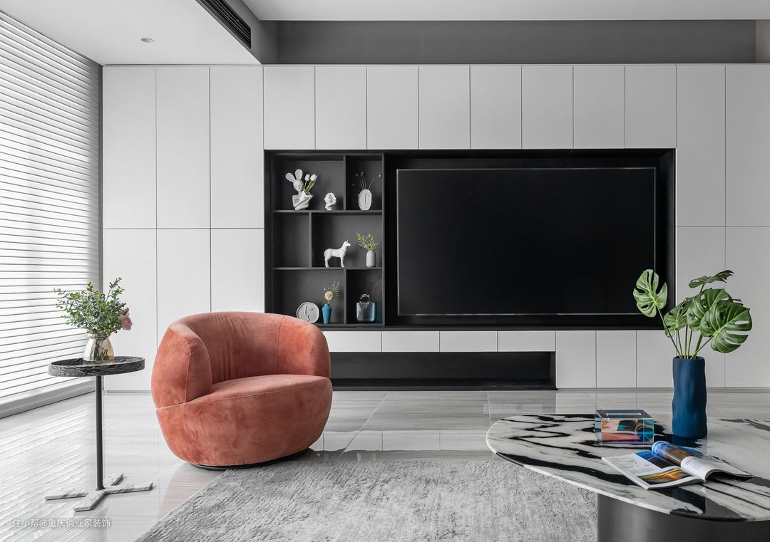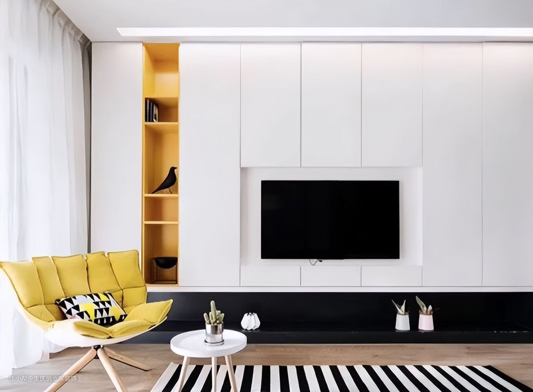 即使你为了节省空间选择不装沙发茶几,但人与电视机的距离还是过近(最小观影距离为2.8m,更不伤眼),不仅影响视觉效果还影响视力。如果选择把电视柜做薄,那就基本上属于做了既不能储物又不能增加视觉效果,纯给自己添堵系列。