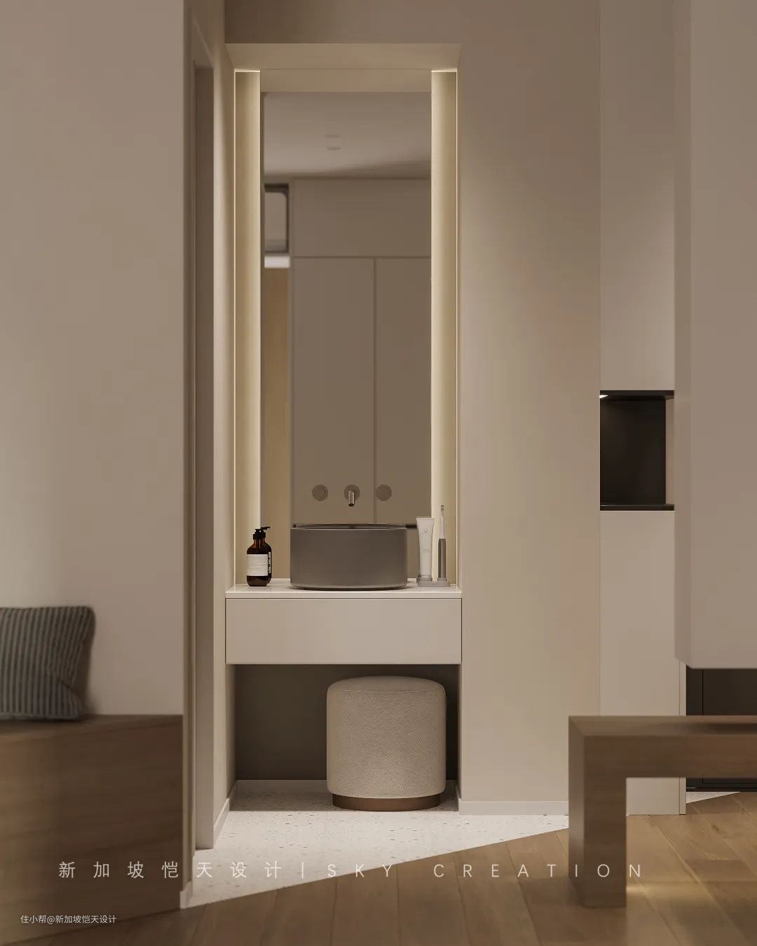 于是设计师将卫生间的洗手区拎了出来,旁边设有玄关柜;在正对入户门的位置。