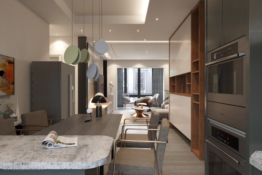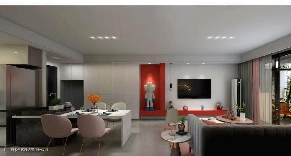 3、客餐厨一体,橱柜与电视墙相连