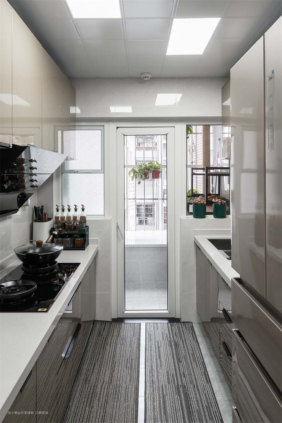 厨房的地面其实比你想象中的要脏、滑很多,毕竟每天做饭产生的油烟最终还是落在地上,所以尽量为厨房选择防滑、易清洁的瓷砖,或者像图中那样铺上大大的防滑垫也是可以的,不过要注意的是不要选择太过小的瓷砖,否则缝隙里会积攒大量的污垢。