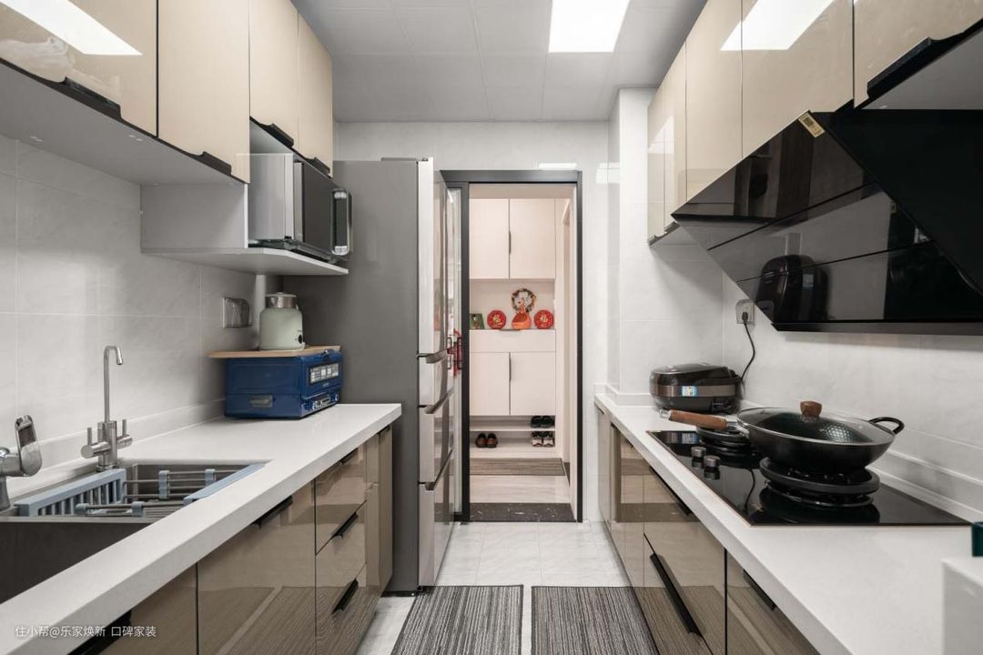 建议是还是将冰箱放在厨房,平时拿取方便,并且可以采用嵌入式设计,将冰箱和橱柜“合为一体”,只需要注意散热和防潮就好了,然后定期擦洗表面的油垢就没问题了。