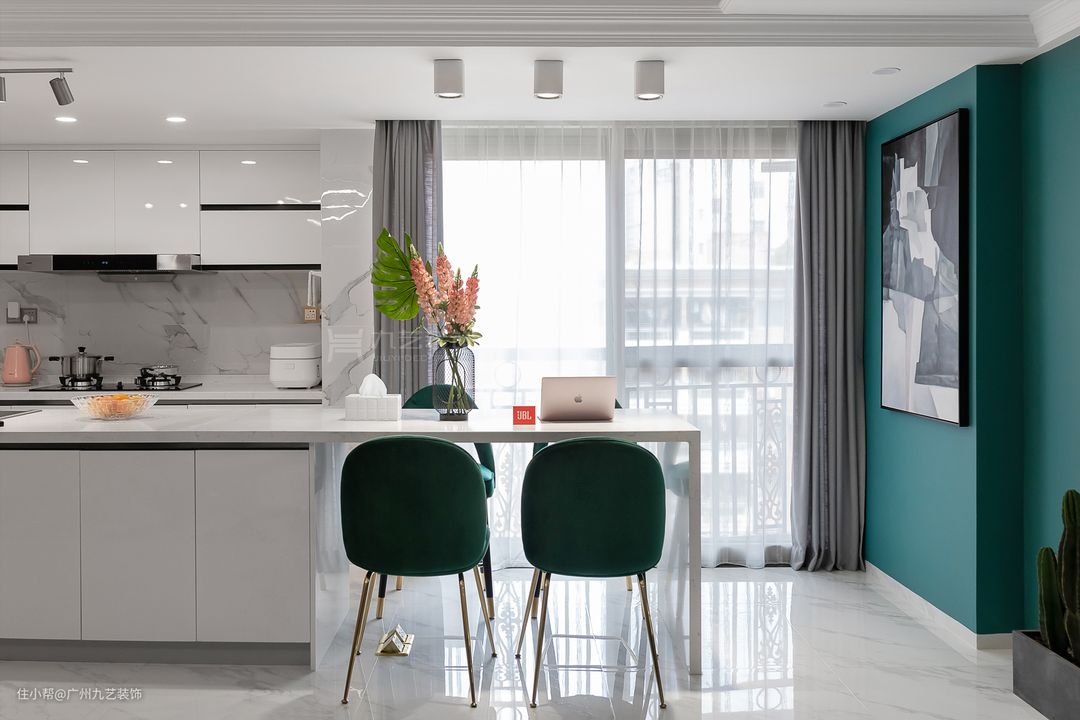 墨绿墙面,一张餐桌,就是一个餐厅。 亲朋好友到访, 它可以是吧台。 工作繁忙时, 它也可以是工作台。