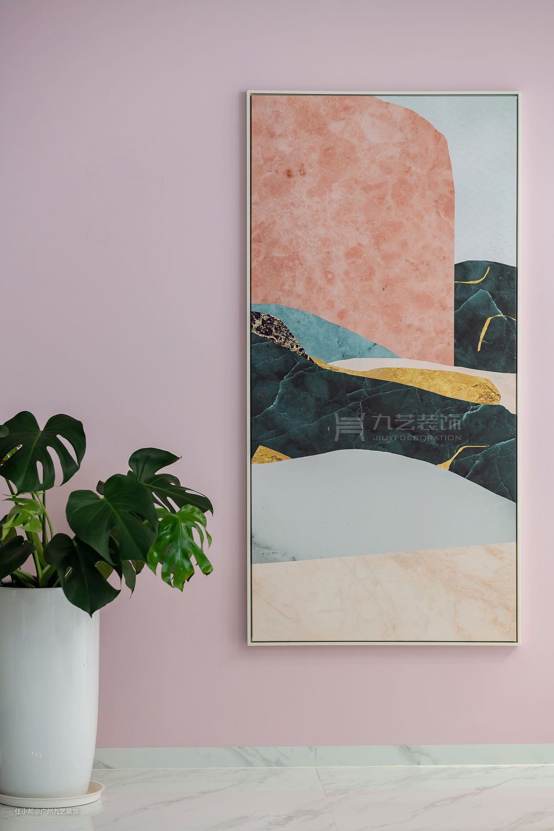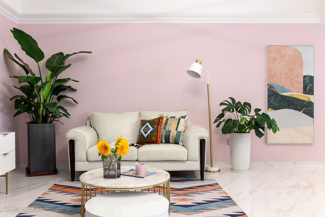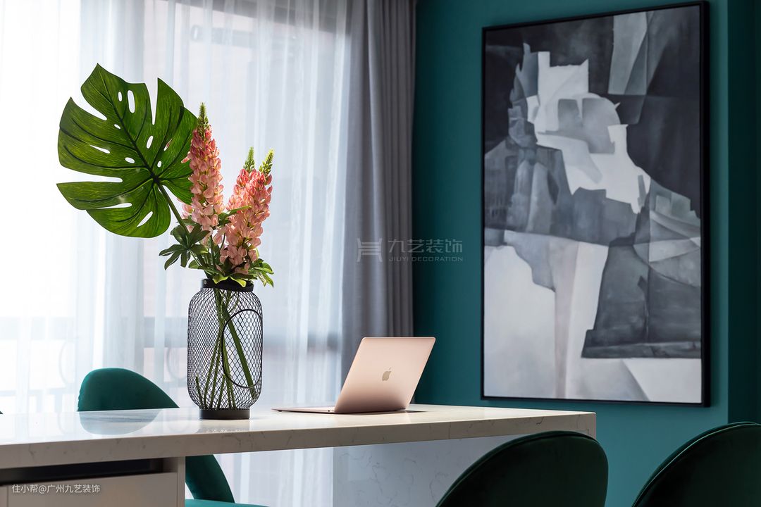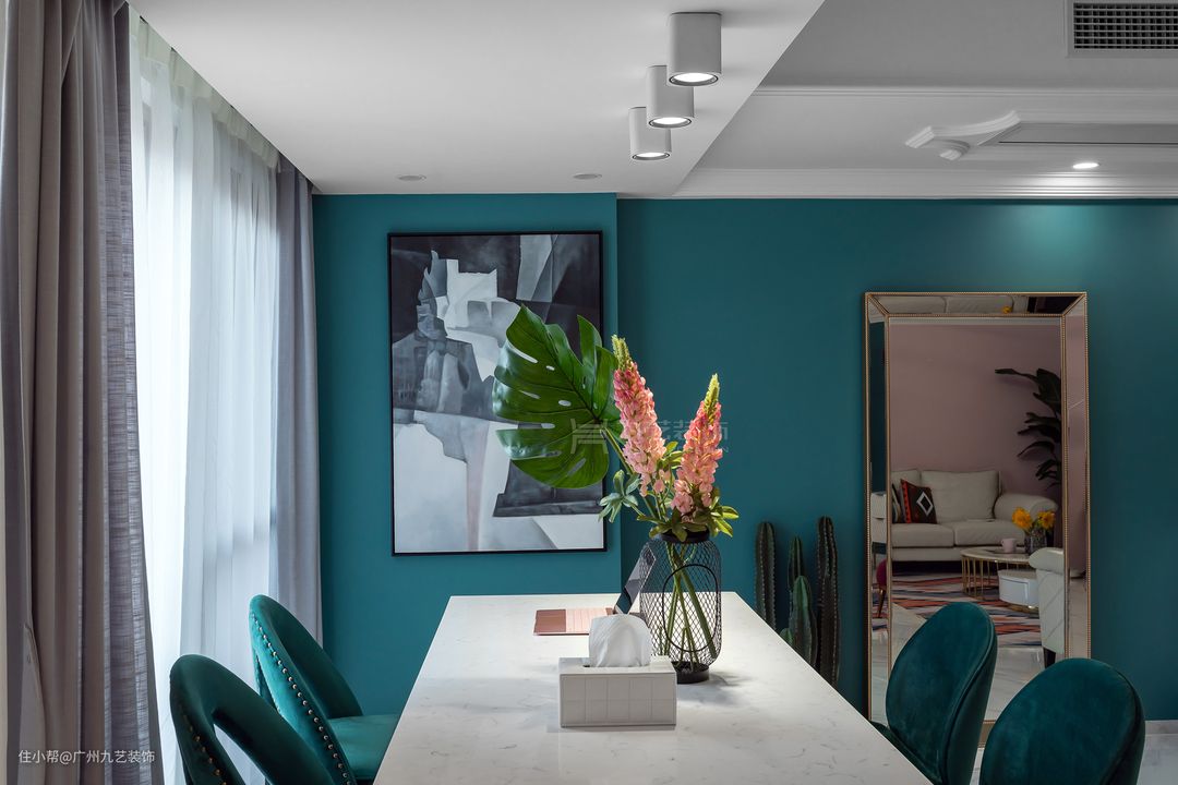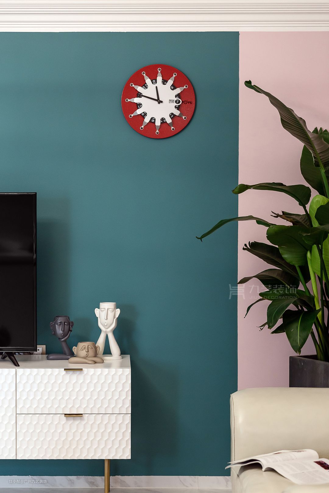 墨绿色与粉色撞色,白色矮柜肌理感十足。