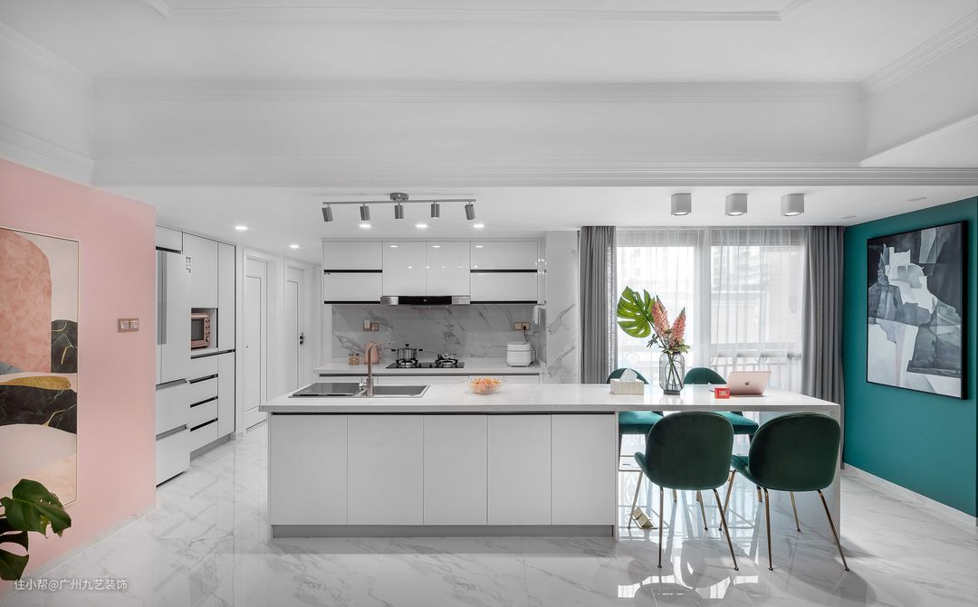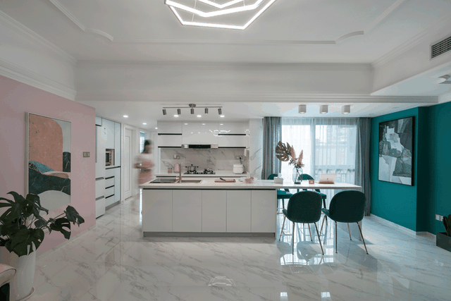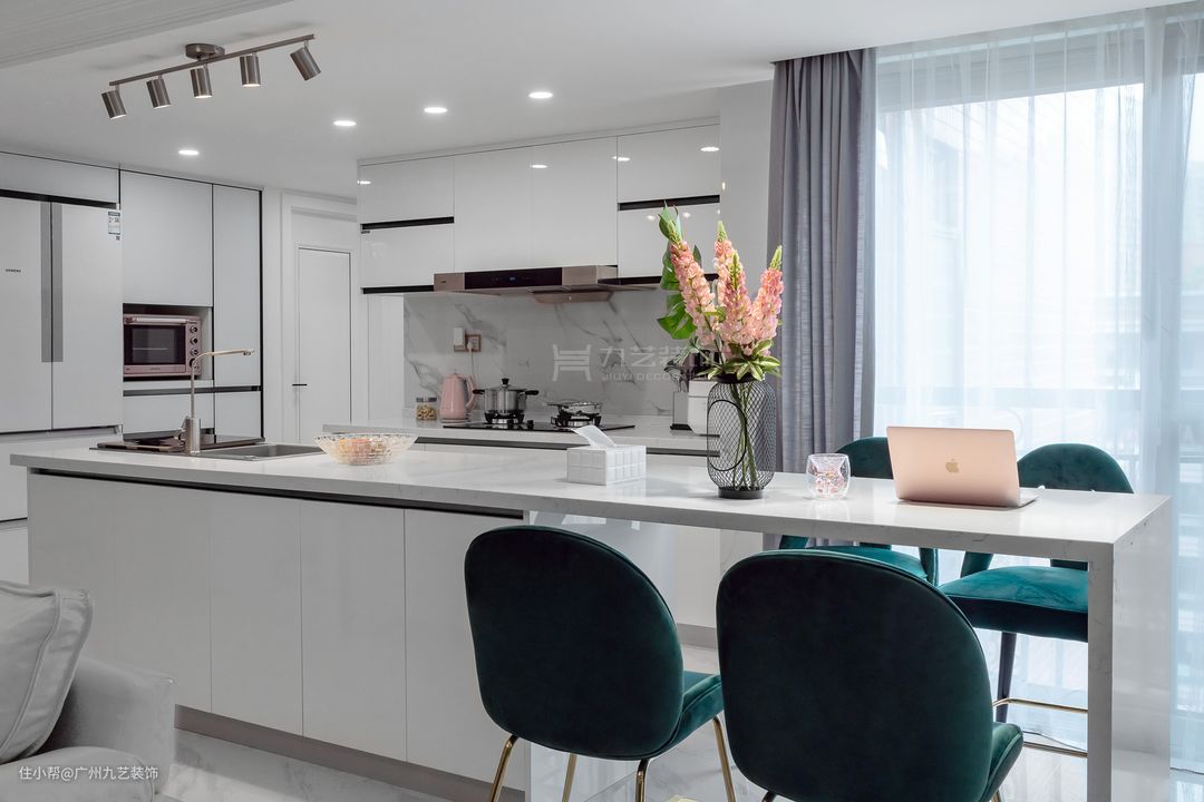2. 同时增加中岛台,与餐桌相连。洗碗机藏在中岛台一端,饭后再也不用纠结谁洗碗了。