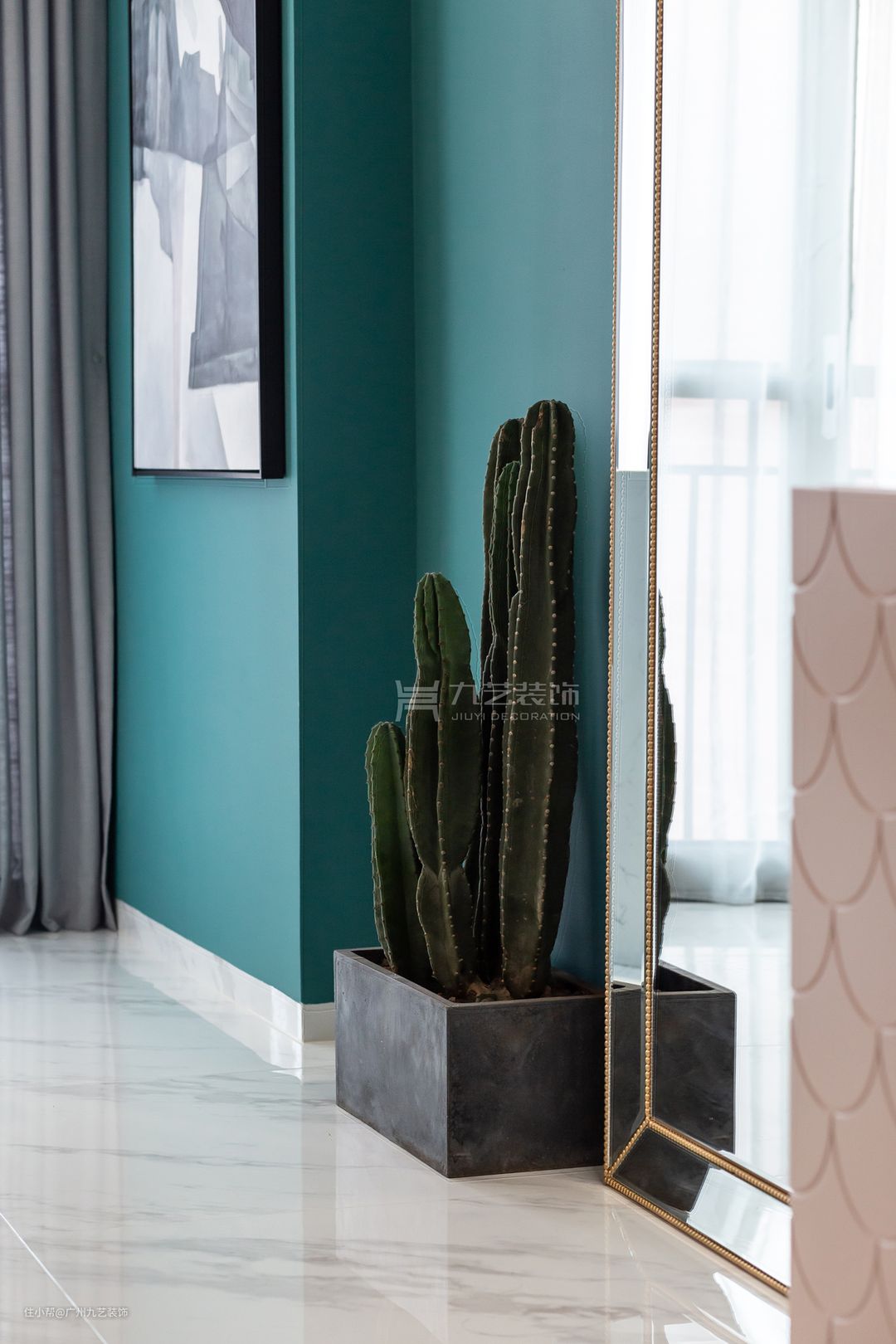 仙人掌旁边是高大落地镜,延伸客厅空间,金色边框带来轻奢感。