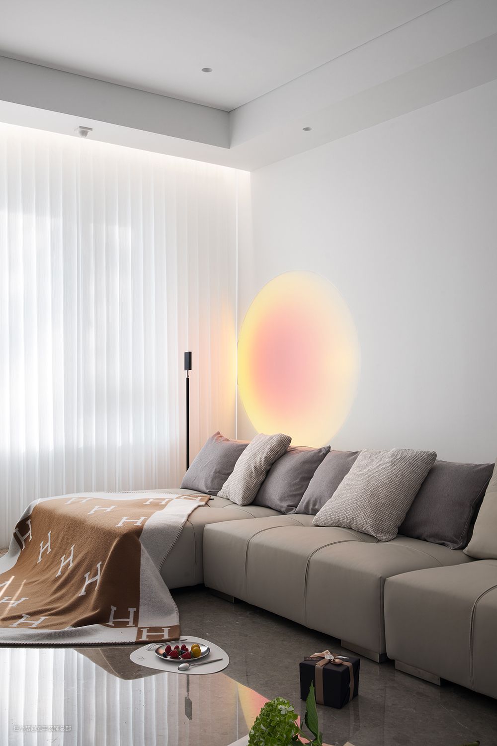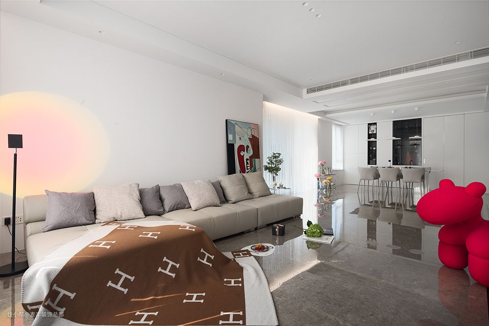 舒适、现代的室内空间氛围,在素雅的浅灰和温润的米白中点缀少量纯净的黑,呈现大气脱俗的质感...圆弧形吊灯堆砌出时尚明快的节奏,筒灯围绕主灯秩序排列,宛如点点星光,在黑夜中闪亮。