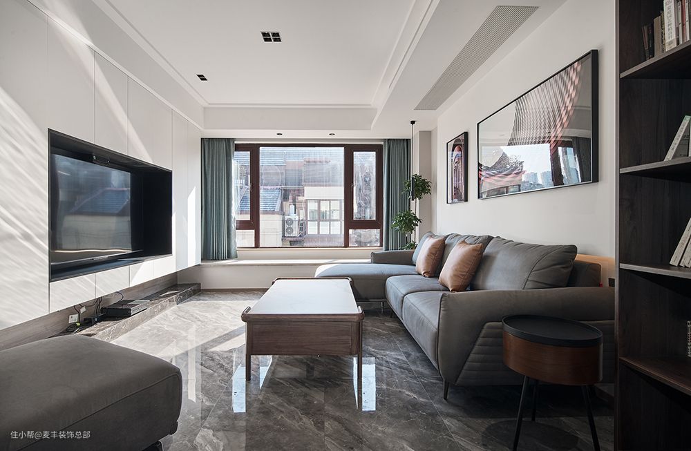 电视墙则为整体设计的定制收纳柜,虽然牺牲了客厅的一部分面积,但却极大的增强了家庭的收纳空间。
