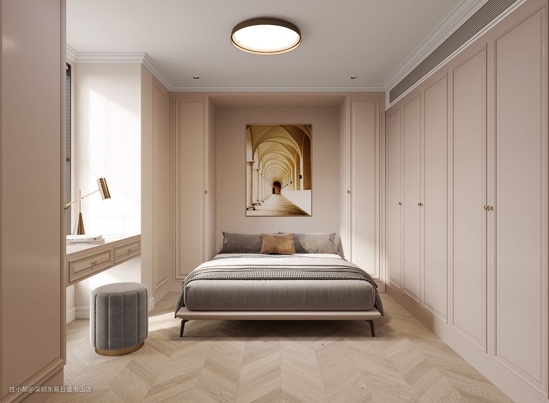 卧室设计,增加一面到顶落地窗,法系色系为主导,温馨十足。