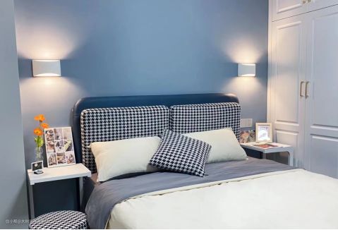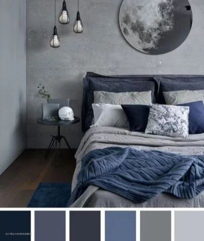 比如将与蓝色相近的深蓝色、宝蓝色(亮度高)、灰蓝色(亮度低)这些放在一起,一下子就突出卧室的空间层次感,显得更加静谧、幽远。